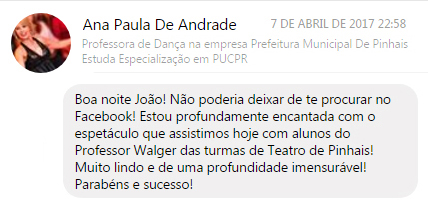 Em 2016 participou do 25º Festival de Teatro de Curitiba – PR e participou de circuito cultural nas escolas municipais de ensino fundamental em Ribeirão Preto-SP.