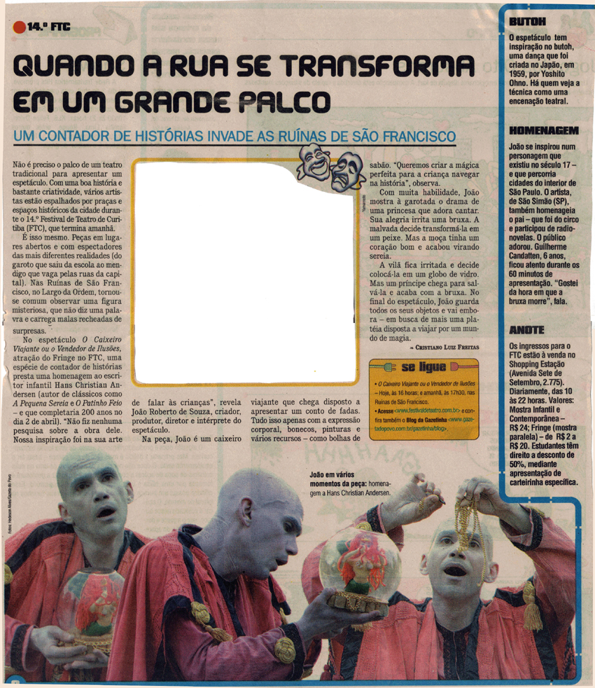 “O balanço dos espetáculos apresentados para crianças e adolescentes durante o 14.º Festival de Teatro de Curitiba (FTC) é positivo. De uma maneira geral, o público teve uma boa variedade de temas e de propostas.