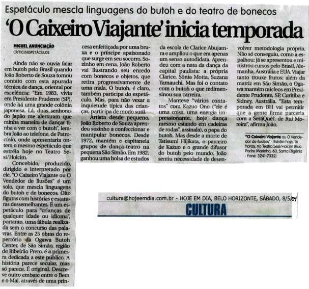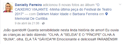 “Hoje, dia 16/05/2004, eu, minha esposa e minha filha, assistimos ao espetáculo “O Caixeiro Viajante”. Excelente espetáculo que se desenvolve num ritmo em que nos faz mergulhar nas profundezas dos contos de fada e nos remete aos contos que criamos de nós mesmos e contamos e recontamos as histórias de nossas vidas. O Ator consegue através de um carisma todo especial, levar até aos espectadores o elemento mágico que nos comove e nos faz chorar diante te tanta beleza. Sua expressão corporal nos hipnotiza e nos faz sonhar. O ator consegue contar de uma forma inovadora, emocionante os contos de fada. A trilha sonora é fantástica. O ator consegue atuar em perfeita harmonia com a trilha sonora. A morte da bruxa é inovadora e nos faz pensar que o fim de tudo que é mal, não é o começo daquilo de bom que o homem quer construir. Depende do homem, dos sentimentos, dos fatos da vida e da atuação de seu criador. Parabéns para o ator e toda a sua equipe.”